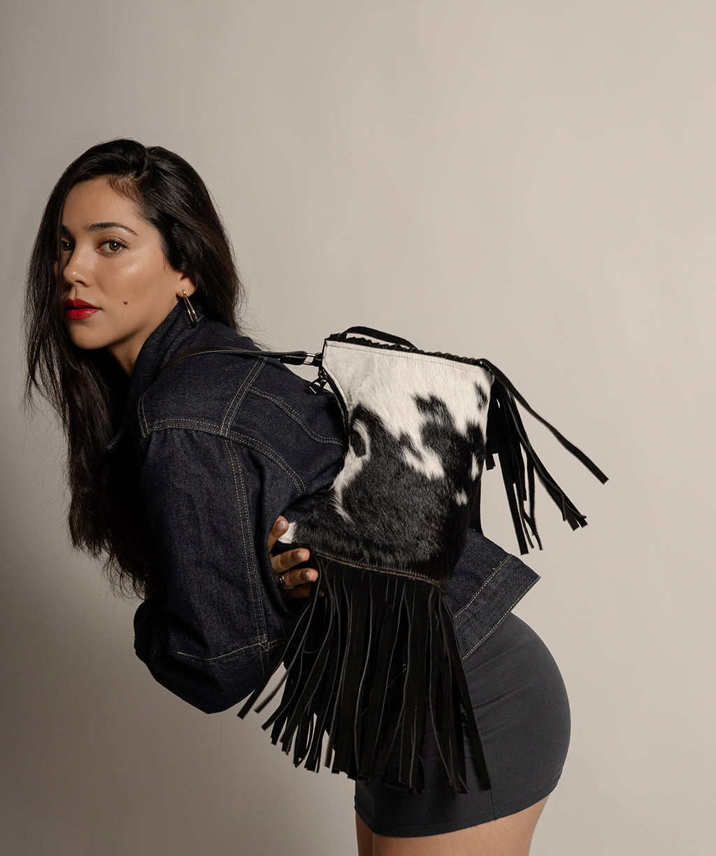 - Material: Piel Bovina con pelo de vaca auténtico con barbas (flecos) laterales de gamuza.